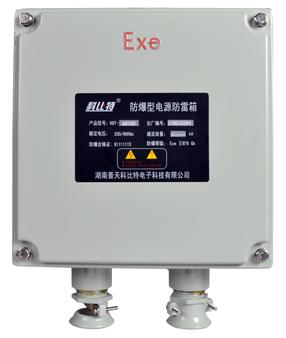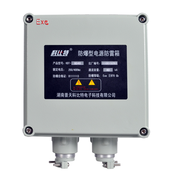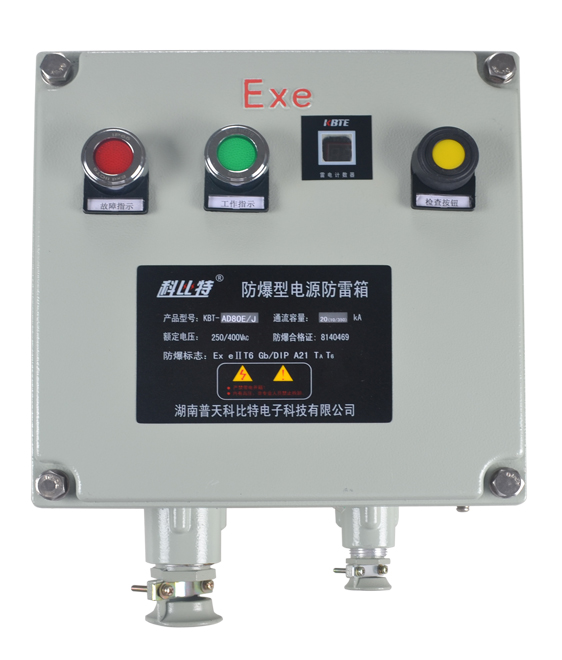 防爆型爱体育(中国)一站式服务平台的箱体是采用符合GB3836.3-2010《爆炸性环境 第3部分:由增安型“e”保护的设备》标准要求的防爆箱,防爆标志是:Ex eⅡ T6 Gb/DIP A21 TA T6。防爆箱内部安装的是按照GB18802.1-2011《低压电涌保护器(SPD) 第1部分 低压配电系统的保护器性能要求和试验方法》标准要求生产的电源防雷模块,并内置了断路器,其中KBT-AD系列配置的电源防雷模块为I级试验(T1)电涌保护器,用于第一级雷电防护,KBT-BD和KBT-CD系列配置的电源防雷模块为II级试验(T2)电涌保护器,分别用于第二级和第三级雷电防护。适合各种电网制式的电源系统,防止雷击产生的脉冲浪涌及瞬间过电压对用电设备造成损害。