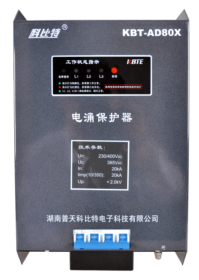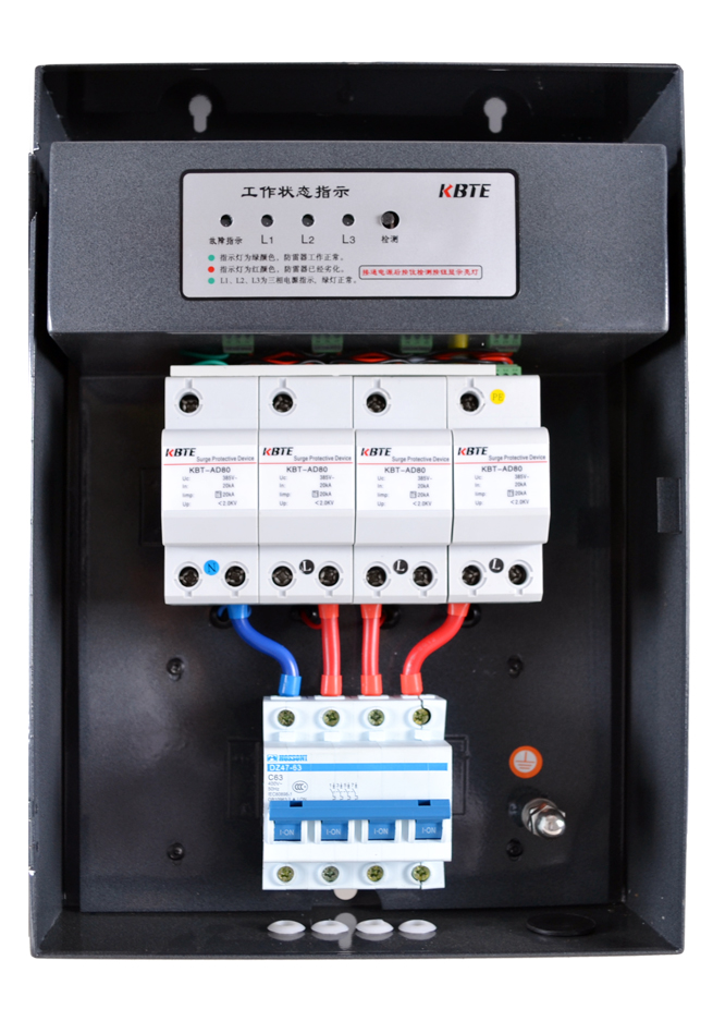 三相爱体育(中国)一站式服务平台内部安装的是符合GB18802.1-2011《低压电涌保护器(SPD) 第1部分 低压配电系统的保护器性能要求和试验方法》标准要求的电源防雷模块,其中KBT-AD系列配置的电源防雷模块为I级试验(T1)电涌保护器,用于第一级雷电防护,KBT-BD和KBT-CD系列配置的电源防雷模块为II级试验(T2)电涌保护器,分别用于第二级和第三级雷电防护。适合TT、TN-C、TN-C-S等各种电网制式的三相电源系统,防止雷击产生的脉冲浪涌及瞬间过电压对用电设备造成损害。该系列爱体育(中国)一站式服务平台并联安装在电源线路上,不影响电源线路的正常工作。