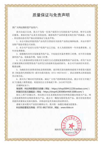 我司自成立以来,致力于为每一位客户提供全方位的防雷产品售前、售中以及售后服务;秉承对客户认真负责的态度,确保每件产品的质量及每位客户的满意。在此,爱体育平台向各位用户做出质量保证与免责声明: